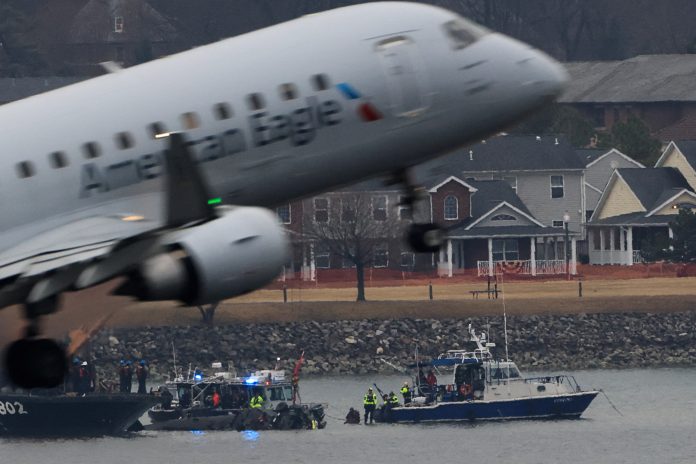 An American Eagle plane departs the Ronald Reagan Washington National Airport, as search and rescue teams work nearby, in the aftermath of the collision of American Eagle flight 5342 and a Black Hawk helicopter that crashed into the Potomac River, in Arlington, Virginia, U.S., Jan. 31, 2025.